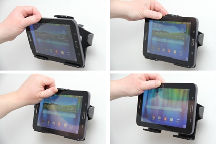 Hållaren är monterad på en kulled och kan vinklas och vridas för att undvika reflexer i skärmen. Du skiftar enkelt mellan stående och liggande läge genom att vrida hållaren till önskad position. Det är lätt att sätta din Galaxy Tab 3 Lite i hållaren, och att ta den med sig när man lämnar bilen.