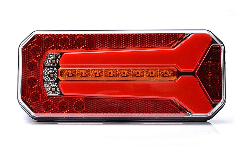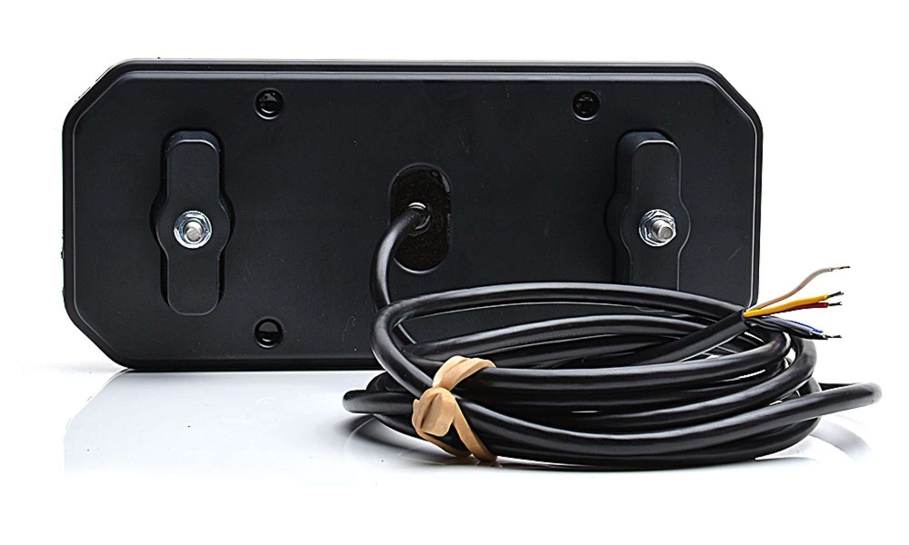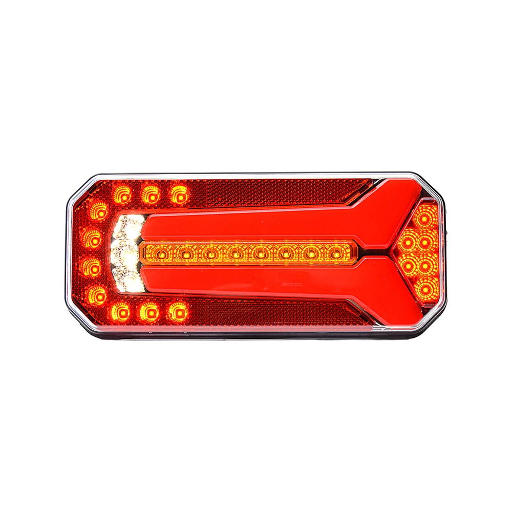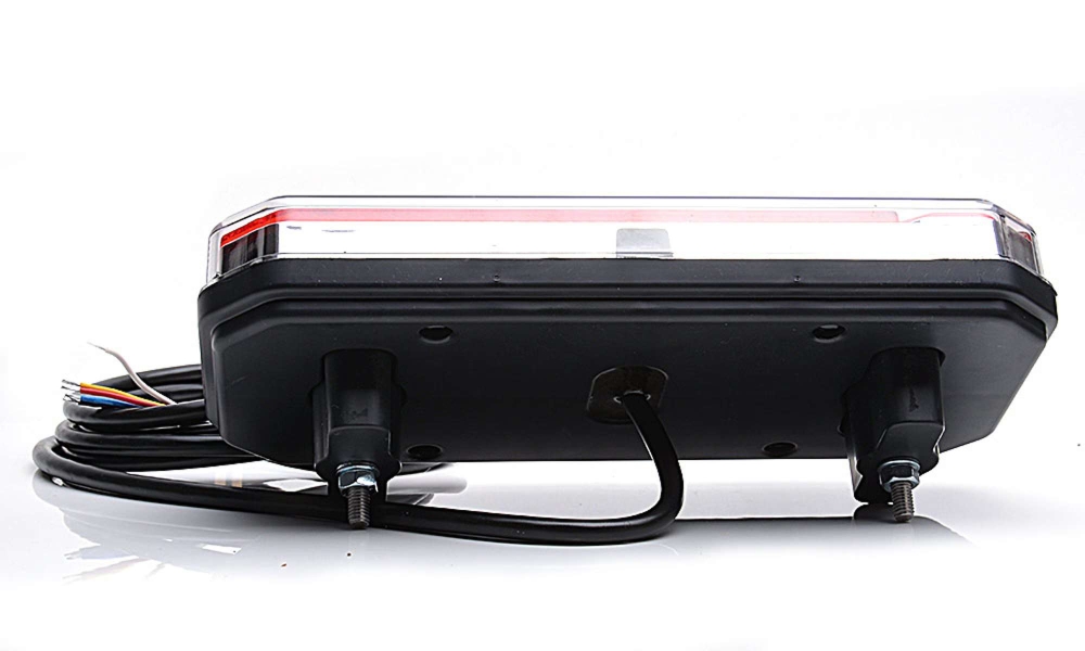 Modern baklampa med fem funktioner: bakljus, bromsljus, blinkers, dimljus och backljus. E-godkänd för vertikal och horisontell montering.