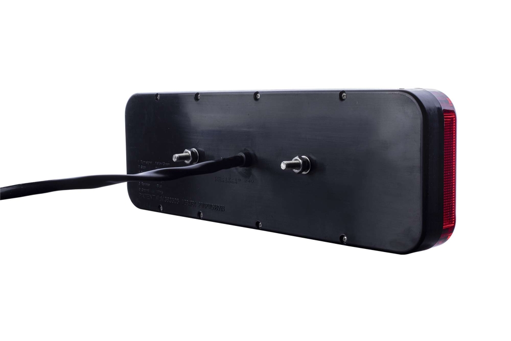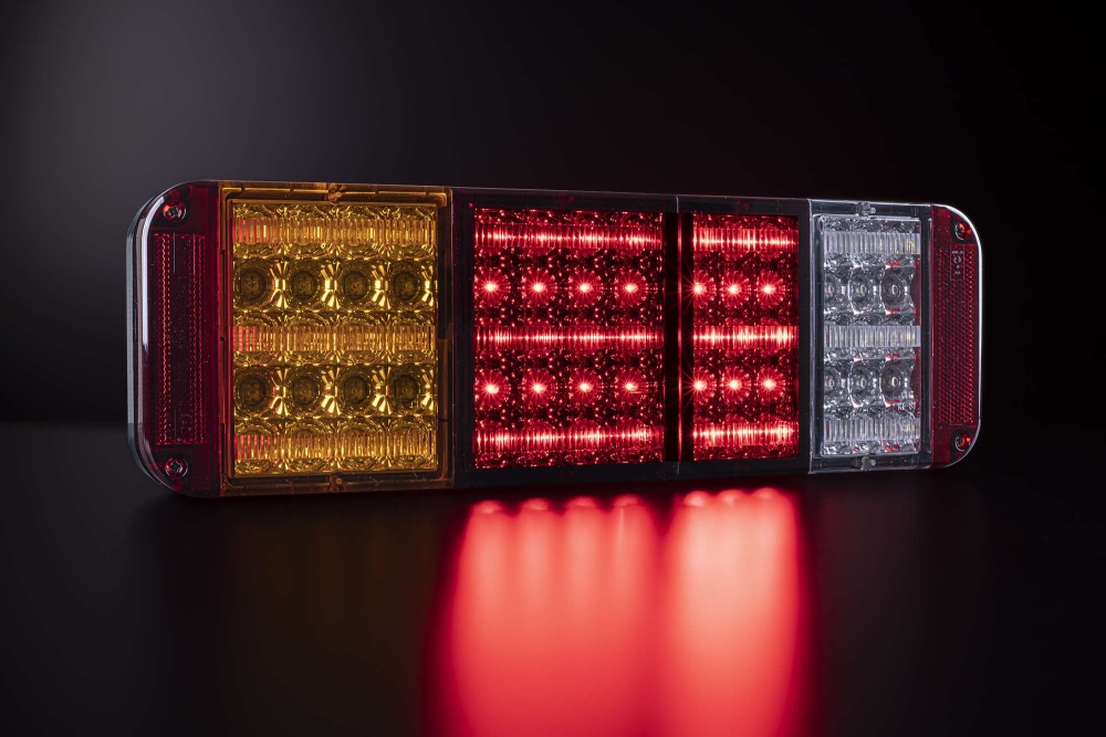 Baklampa med fem funktioner (bakljus, broms, blinkers, dimljus, backljus) i LED, enkel design och lång hållbarhet.